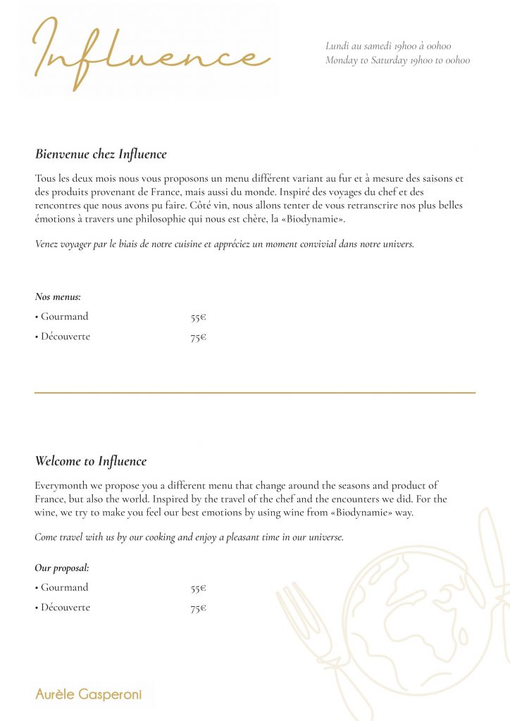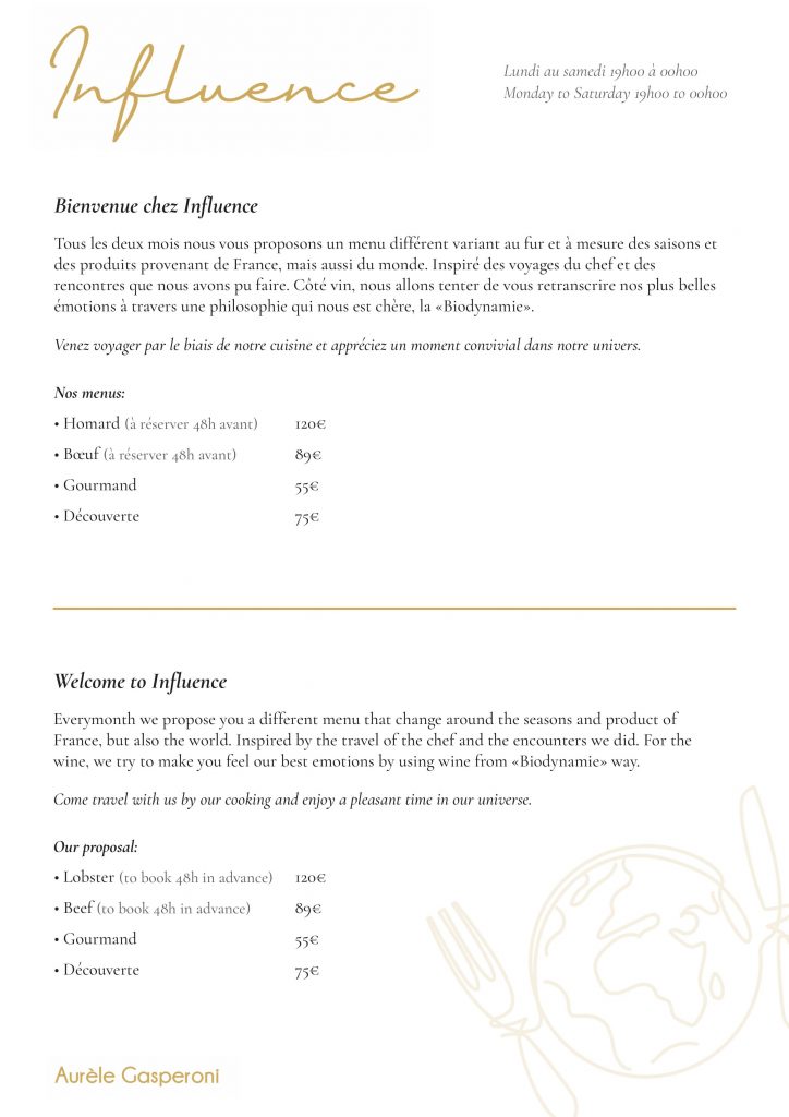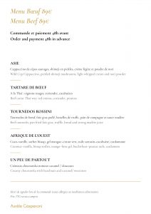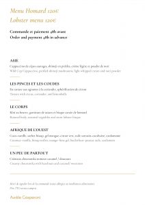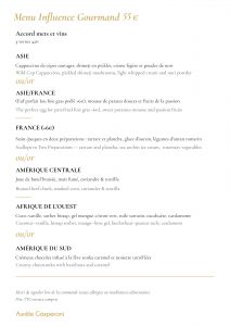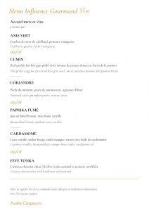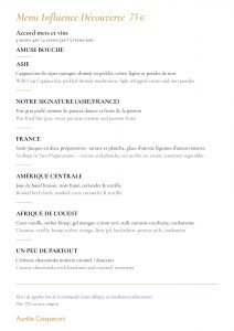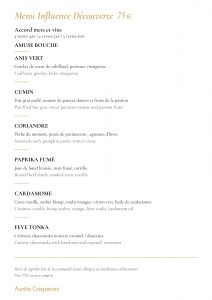 Tous les deux mois nous vous proposons un menu différent variant au fur et à mesure des saisons et des produits provenant de France, mais aussi du monde. Inspiré des voyages du chef et des rencontres que nous avons pu faire. Côté vin, nous allons tenter de vous retranscrire nos plus belles émotions à travers une philosophie qui nous est chère, la « Biodynamie ». Venez voyager par le biais de notre cuisine et appréciez un moment convivial dans notre univers.